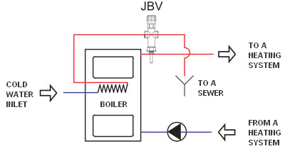 Zawór termostatyczny jednofunkcyjny to rozwiązanie służące do zabezpieczenia kotła jak i instalacji przed nadmierną temperaturą powodującą gotowanie. Stosowany głównie na Zachodzie w obiegach zamkniętych. W przypadku nadmiernego wzrostu temperatury czujnik otwiera zawór termostatyczny. Poprzez otwarty zawór (pojedynczego działania) zimna woda z wodociągu wpływa do kotła i uniemożliwia zagotowanie wody c.o. Wylatującą wodę można spuścić np. do kanalizacji. Gdy temperatura spadnie do bezpiecznej wysokości zawór automatycznie się znowu zamyka. Zabezpieczenie instalacji zaworem termostatycznym pozwala utrzymać stan czynnika roboczego w instalacji grzewczej (np. płyn niezamarzający) w stanie niezmienionym pomimo wystąpienie awaryjnego trybu pracy - schładzania kotła i instalacji C.O. Obieg schładzania jest tu odseparowany od obiegu grzania. Temperatura otwarcia zaworu: 97 stopni Celsjusza Zastosowanie: do kotłów o mocy do 93 kW Temperatura minimalna: -10 stopni Celsjusza Pomiary gwintu montażowego: Pomiary gwintów przyłączeniowych