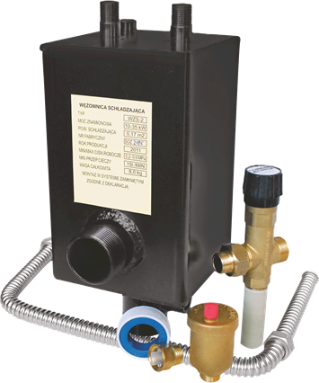 Wężownica schładzająca WZS -2 wraz z zaworem jednofunkcyjnym schładza instalację gdy temperatura przekroczy 95 stopni Celsjusza, nie dopuszczając do zagotowania się wody. W niektórych kotłach wężownica schładzająca jest już wbudowana (wężownica wewnętrzna) w kocioł np. Atmos, Orlan Super, za opłatą: Dakon Dor, Ogniwo S6WC 12,6-20kW. W innych kotłach stalowych oraz we wszystkich kotłach żeliwnych wężownica musi zostać wpięta w instalację jako osobny element.